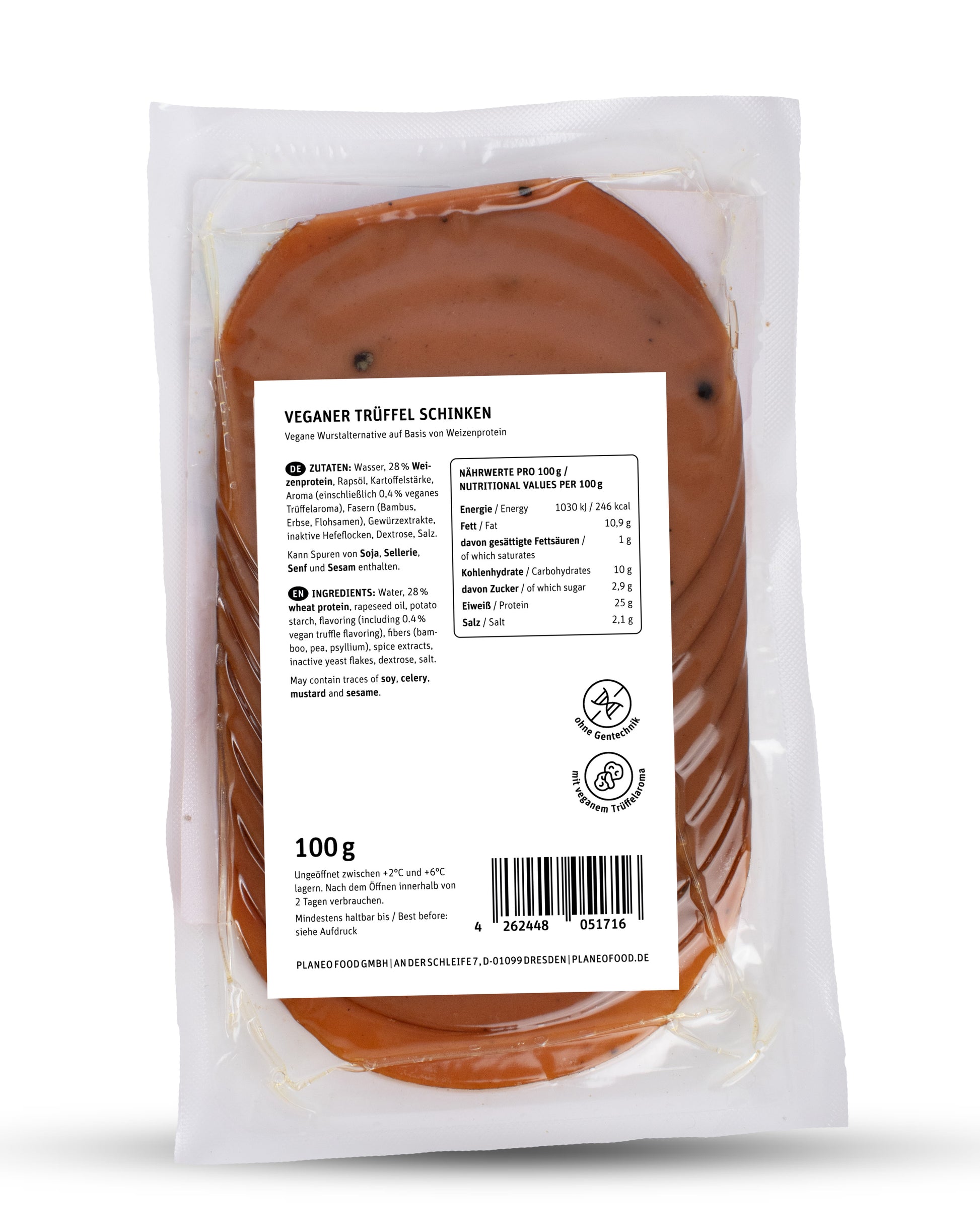 Der Vegane Trüffel Schinken 100g von planeo ist eine ganz besondere, vegane Wurstalternative. Feine, vegane Schinkenscheiben gepaart mit 100% veganem Trüffelaroma, super lecker gewürzt und mit hohem Eiweißanteil. Einfach traumhaft lecker und von keiner veganen Wurstplatte mehr wegzudenken!